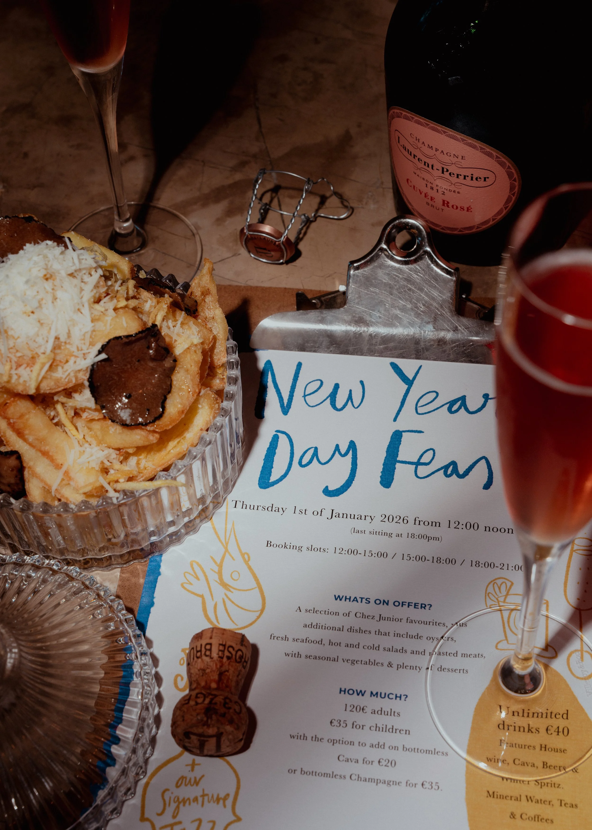 A daytime celebration across three seating times, set in a beautifully decorated space with live jazz and a warm, festive atmosphere. Guests will enjoy signature Chez Junior dishes enhanced with seasonal highlights — from oysters and fresh seafood to vibrant salads, roasted meats and indulgent desserts.